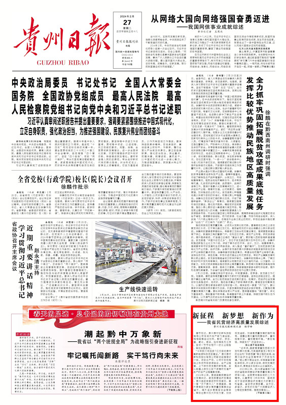 如今,一位位民營經(jīng)濟(jì)人士投資貴州、一家家民營企業(yè)迅速崛起,在各級(jí)黨委政府的引導(dǎo)支持下,廣大民營經(jīng)濟(jì)人士在黔貴大地實(shí)現(xiàn)夢(mèng)想,眾多民營企業(yè)乘勢(shì)而上,為推進(jìn)中國式現(xiàn)代化貴州實(shí)踐貢獻(xiàn)力量。